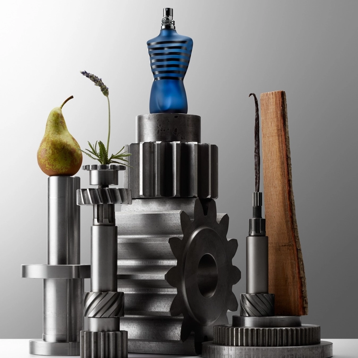 O frasco de Le Male Ultra mantém o design icônico em formato de torso masculino, símbolo de virilidade e ousadia. Nesta versão, é feito em vidro azul-marinho intenso com listras pretas foscas, transmitindo força e mistério. A tampa prateada metálica em formato de borrifador completa o design exclusivo, reforçando a identidade provocante e sensual da linha Jean Paul Gaultier.