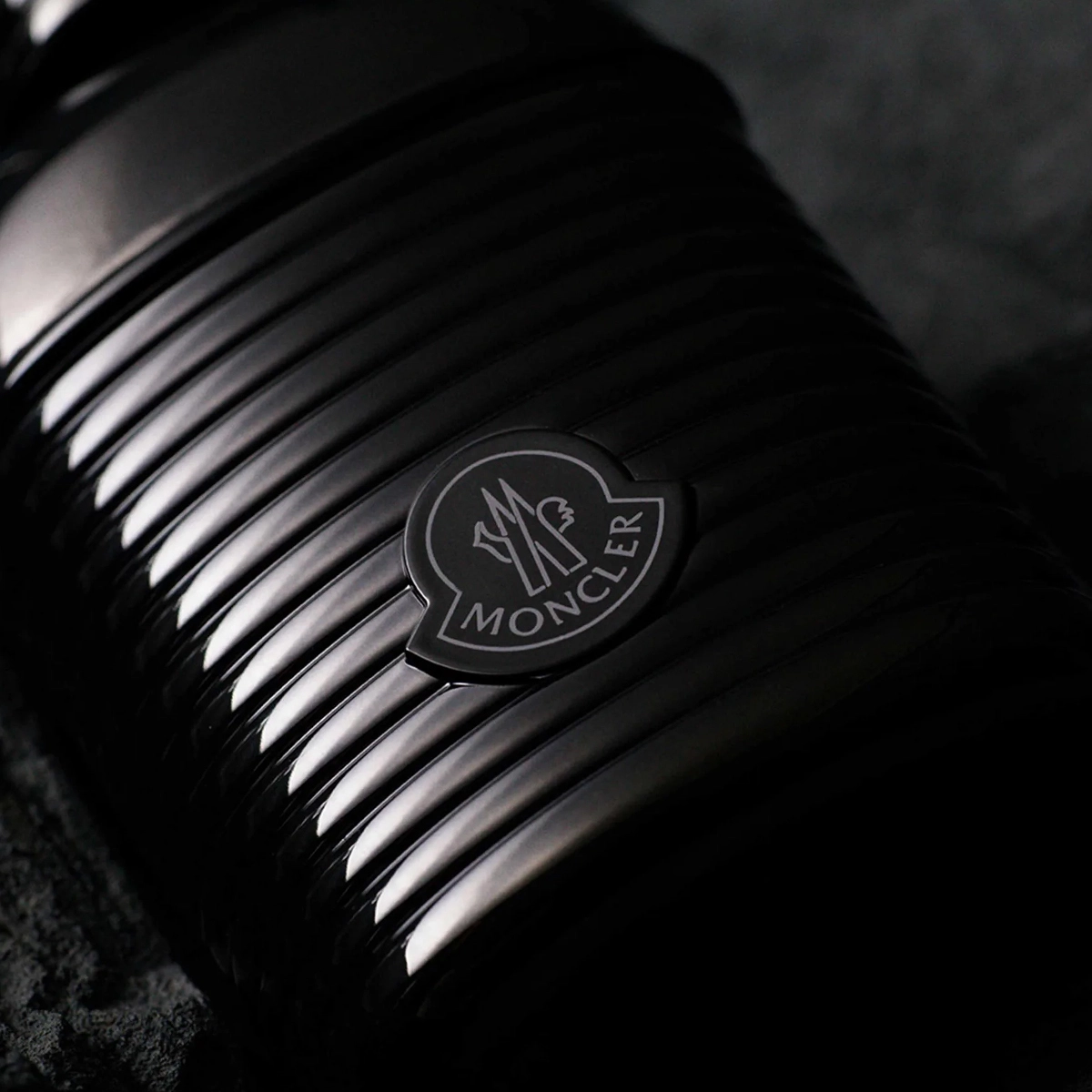 O frasco continua inspirado no acolchoado da icônica jaqueta de neve da Moncler em um cinza chumbo metalizado que representa o completo escuro antes do amanhecer dourado nas montanhas dos alpes franceses.