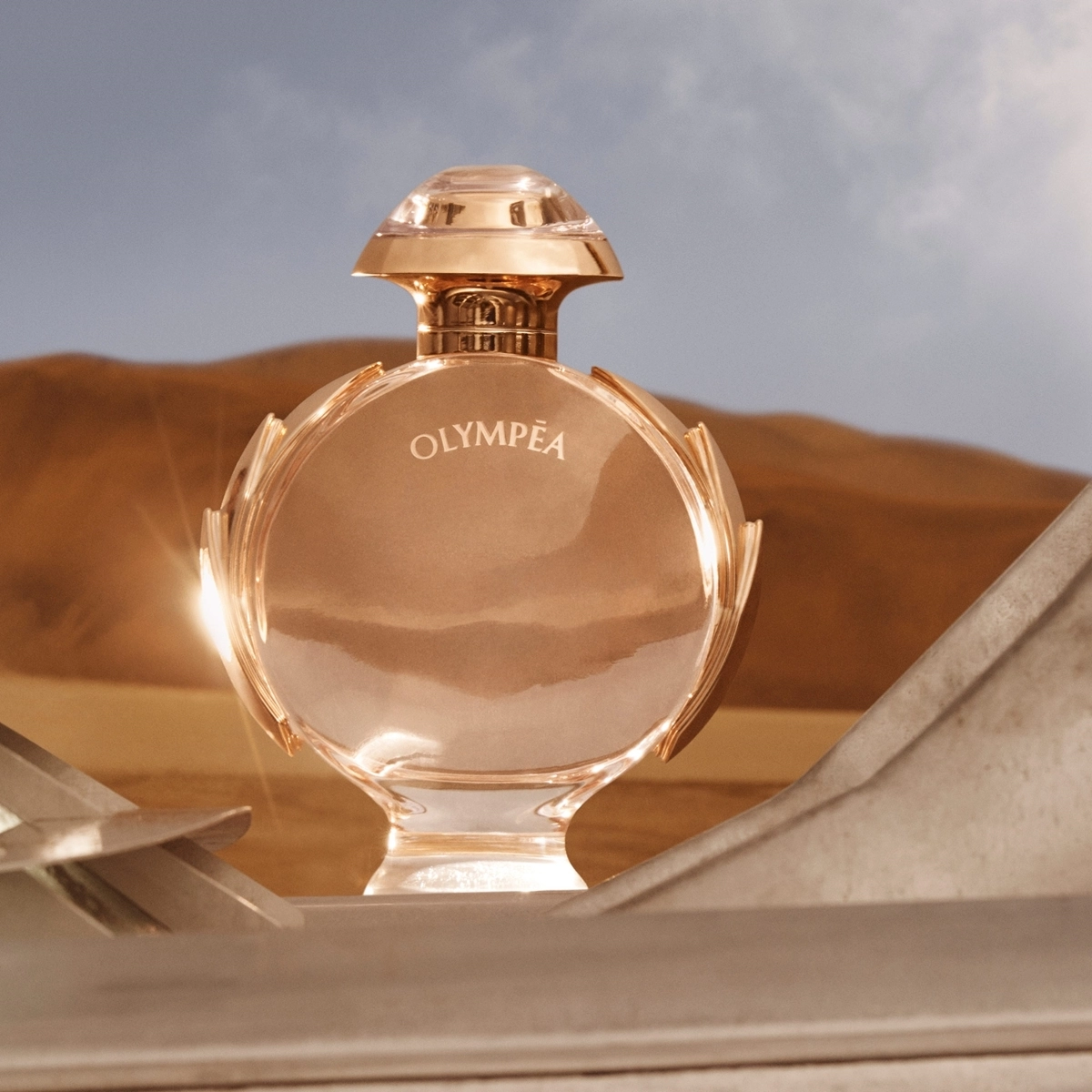 O frasco de Olympéa é redondo e luxuoso, feito em vidro transparente espesso que revela o líquido em tom rosa-pêssego dourado. A estrutura é decorada com detalhes em metal rosé-dourado, que lembram coroas de louros, símbolo de vitória e poder. A tampa arredondada metálica completa o design sofisticado, reforçando o conceito de uma fragrância digna de uma deusa moderna. O visual transmite luxo, feminilidade e imponência.