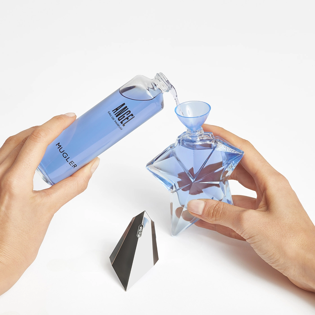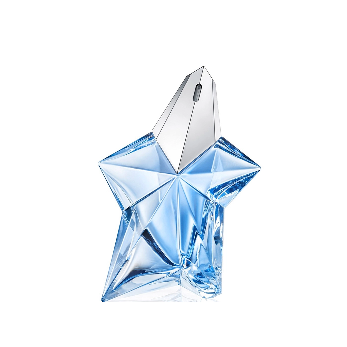 O frasco é uma escultura em forma de estrela de cinco pontas, com vidro facetado em tons de azul celeste translúcido. As superfícies polidas captam a luz de diferentes ângulos, criando reflexos que remetem ao universo onírico e futurista de Mugler. A estrutura é robusta, com acabamento prateado nos detalhes da válvula. Um frasco que é ao mesmo tempo joia e obra de arte, símbolo eterno da perfumaria de vanguarda.